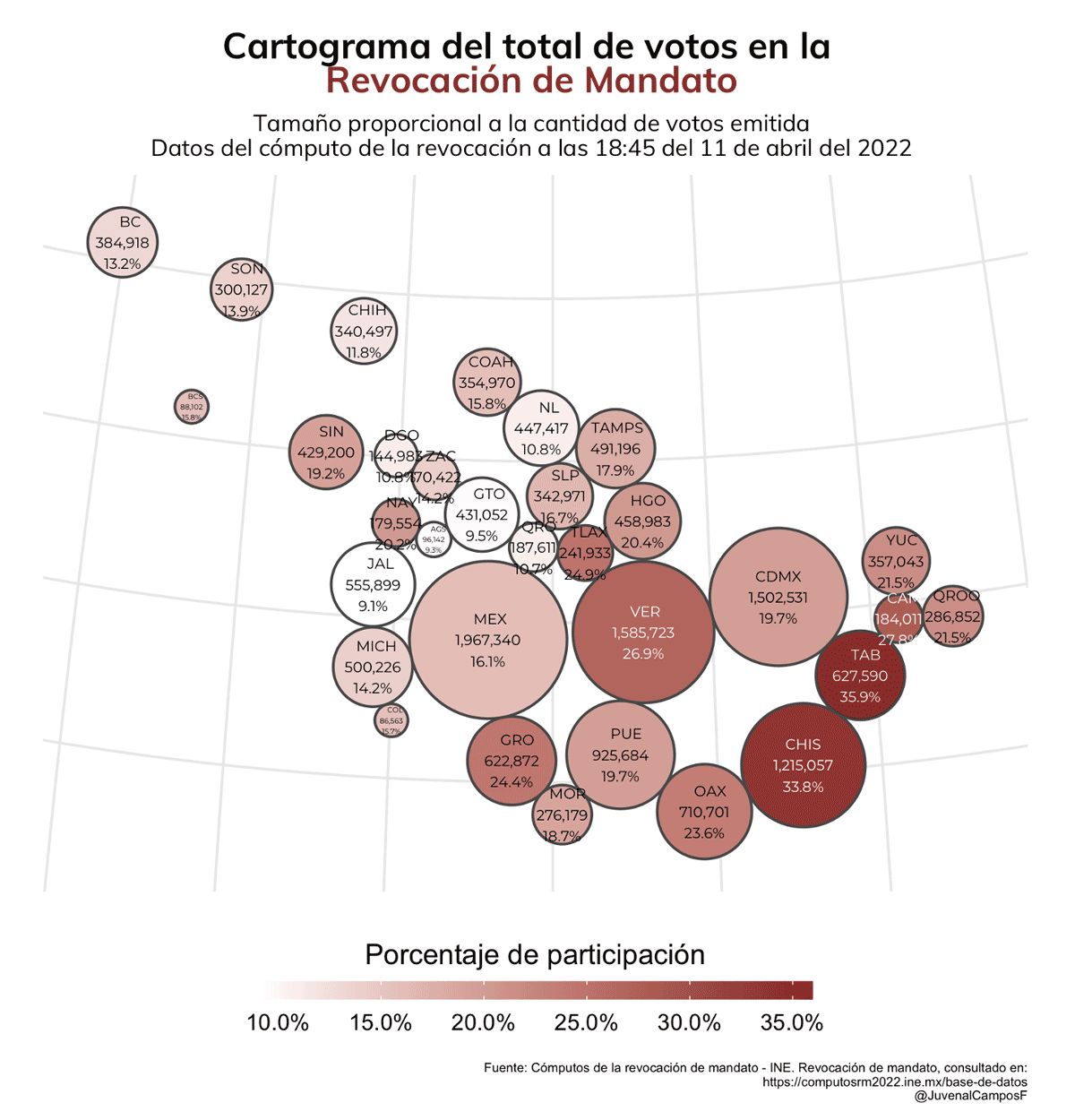 La cantidad de votos emitidos en cada entidad se puede ver en el siguiente mapa, el cual combina esta información con la posición geográfica y la tasa de participación. De estos estados, podemos ver que el Estado de México, Veracruz y la Ciudad de México son las tres entidades que más votos aportaron al proceso de revocación (casi 5 millones, aproximadamente una tercera parte del total) y que los estados con mayor porcentaje de participación no necesariamente son los que más aportaron en cantidad de sufragios emitidos. De igual manera, que Jalisco, Guanajuato y Nuevo León hayan aportado una cantidad de votos similar a entidades como Morelos o Tlaxcala, evidencia la falta de movilización y de interés por participar en estas entidades.