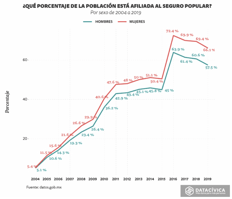 Como sabemos, el Seguro Popular se formuló con el objetivo específico de atender a aquellas personas que no son derechohabientes ni del IMSS ni del ISSSTE. Las mujeres en México están sub representadas dentro de los derechohabientes. En 2019, sólo el 19% de las mujeres estaban afiliadas al Instituto Mexicano del Seguro Social, mientras el 28% de los hombres lo estaban. En 2019, a pesar de representar el 51% de la población, las mujeres sólo representaron el 42% de los asegurados.