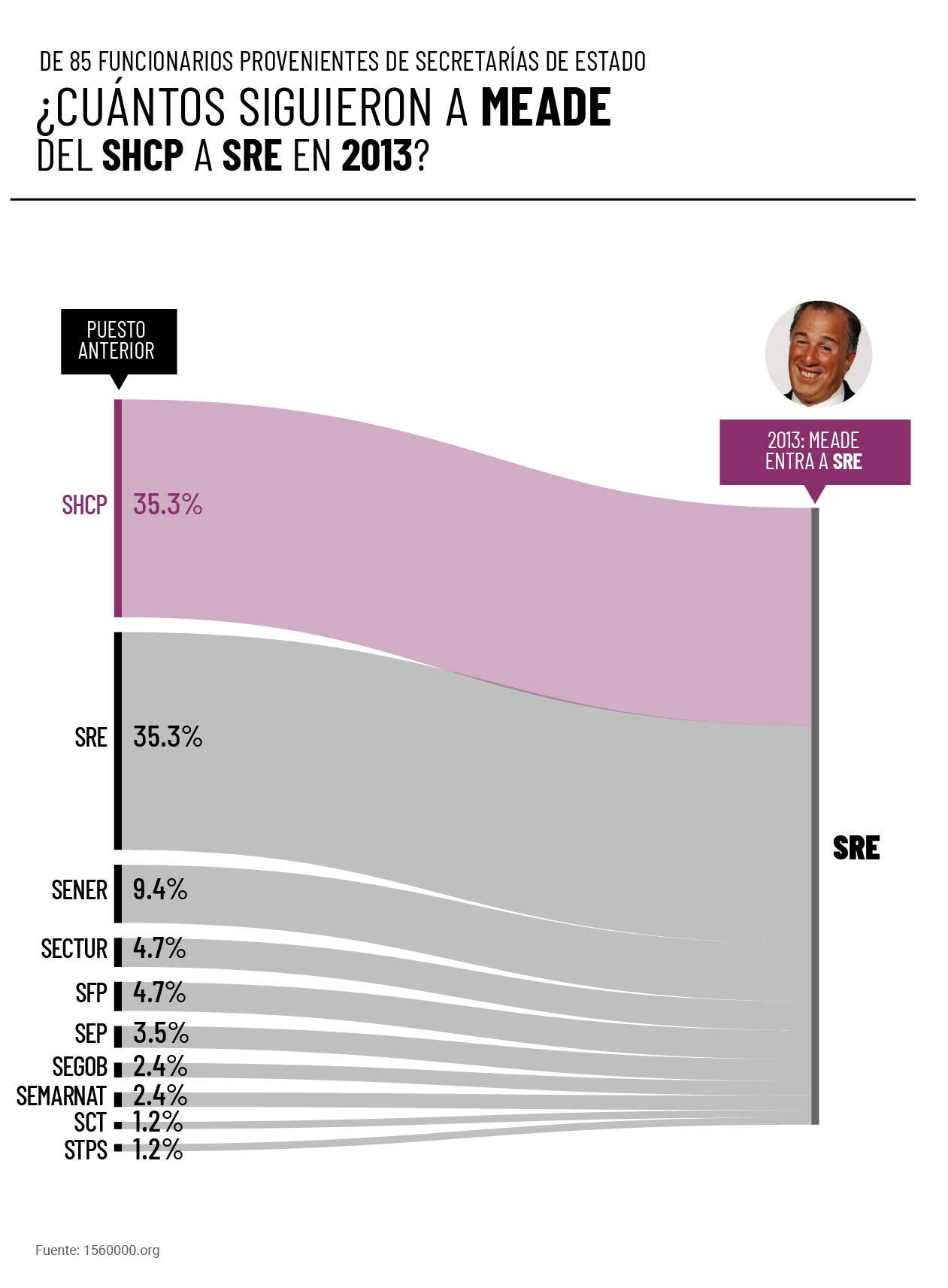 Con el cambio de gobierno en 2012 Meade sólo tuvo que trasladarse unas cuadras desde Palacio Nacional, donde ocupaba la Secretaría de Hacienda con Calderón a la sede de la Secretaría de Relaciones Exteriores en la Avenida Juárez. Analizando las declaraciones de inicio de los funcionarios de la SRE que ingresaron en 2013, podemos saber quiénes venían de Hacienda y por tanto siguieron a Meade en este cambio. El 35% de los funcionarios que ingresaron a la SRE en 2013 provenían de la Secretaría de Hacienda tomando solo en cuenta los cambios entre secretarías de estado.