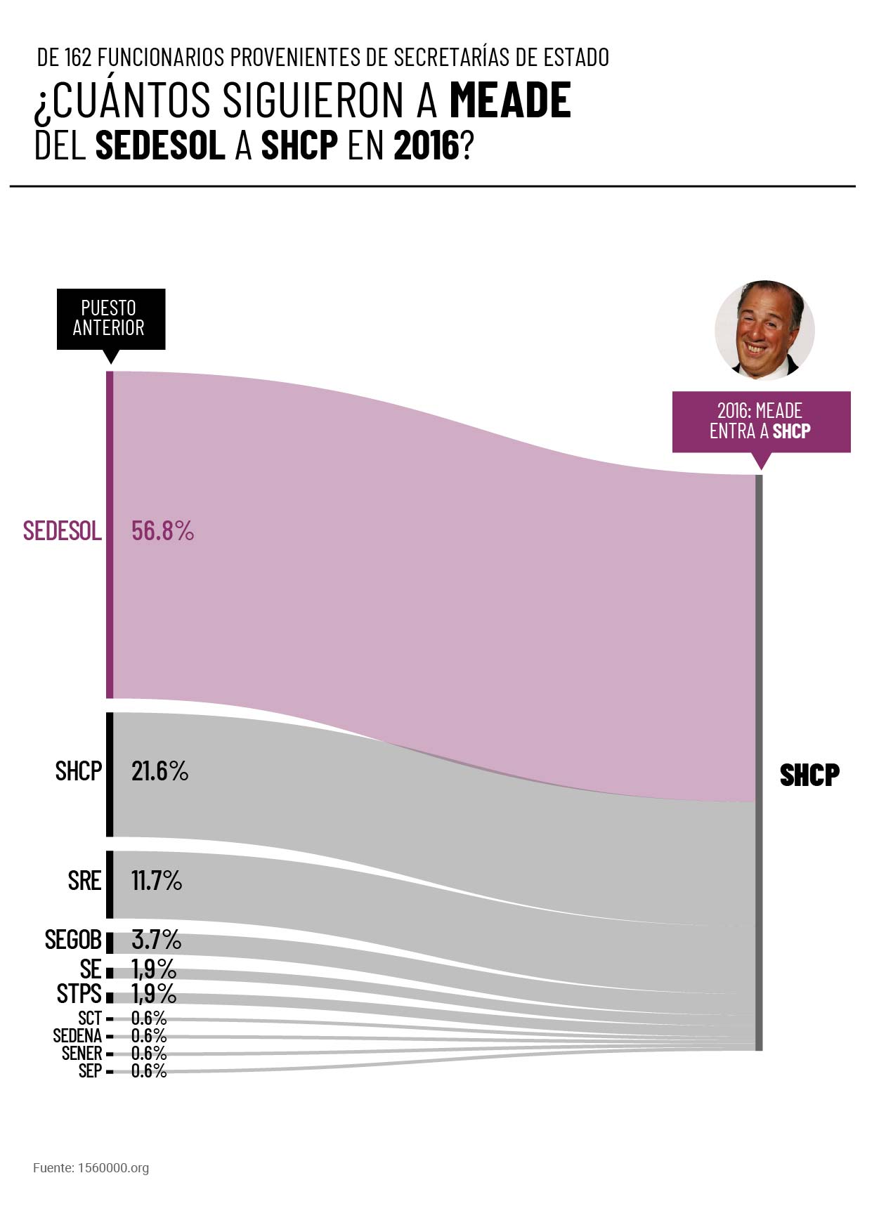 Podemos seguirle la pista a un caso emblemático, por ejemplo, el de José Antonio Meade. El hoy candidato del PRI a la Presidencia de la República ha sido 5 veces Secretario de Estado en dos administraciones de partidos diferentes. En el sexenio de Felipe Calderón, Meade fue Secretario de Energía y de Hacienda. Con Enrique Peña Nieto, Meade como mencionamos estuvo al frente de la SRE, de SEDESOL y de la SHCP. ¿Cuántas personas lo han seguido en su trayectoria durante el último sexenio?