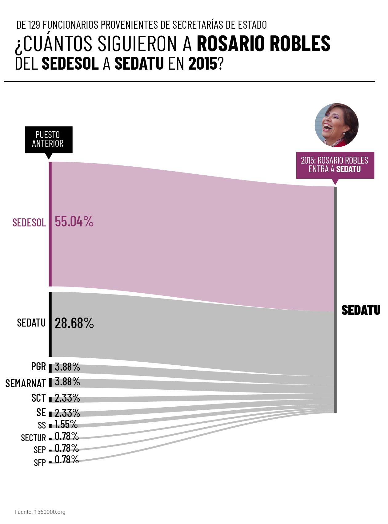 Más de la mitad de los funcionarios que ingresaron a la SEDATU a partir de la llegada de Robles Berlanga, provenientes de otras secretarías, provenían de la SEDESOL. Esto es, de los 129 funcionarios que asumieron un cargo nuevo en la SEDATU en 2015, 71 venían de trabajar con Rosario Robles. Casi el doble de los funcionarios que asumieron un nuevo cargo al interior de la propia SEDATU.
