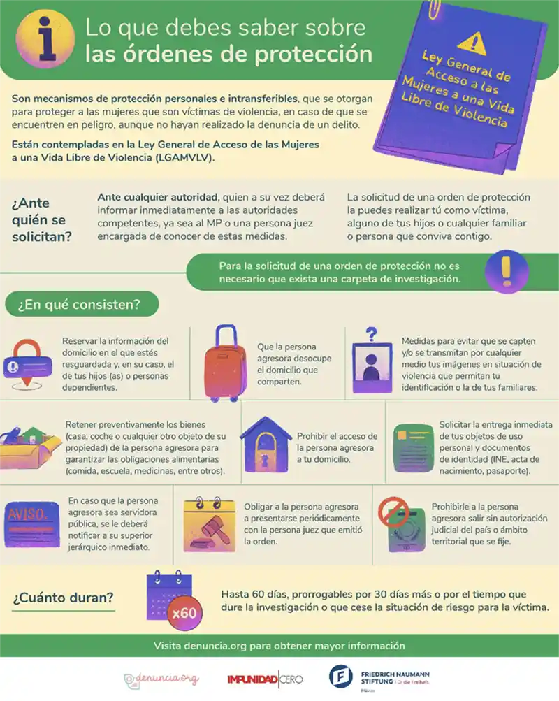 La LGAMVLV contempla mecanismos que se otorgan para proteger a las mujeres que son víctimas de violencia en caso de que se encuentren en peligro. Estos se conocen como órdenes de protección y pueden ser emitidas por autoridades administrativas como Ministerios Públicos e incluso los Centros de Justicia para las Mujeres (Cejum). También pueden ser otorgadas por autoridades jurisdiccionales como los jueces. Para la solicitud de una orden de protección no es necesario que exista una carpeta de investigación, y puede solicitarlas tanto la víctima como cualquier persona que tenga conocimiento de un delito que pone en riesgo la integridad de mujeres o niñas. Una de estas órdenes puede comprender diferentes medidas y aunque tienen una duración de hasta sesenta días, pueden extenderse en caso de que no cese la situación de riesgo para la víctima.3