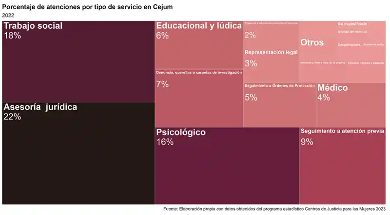 En 2022 los servicios que más se brindaron en los Cejum fueron asesoría jurídica (22 %), trabajo social (18 %), atención psicológica (16 %), servicios de seguimiento (9 %), y apoyo para denunciar o poner una querella (7 %). Cabe mencionar que una misma usuaria puede solicitar más de un servicio.