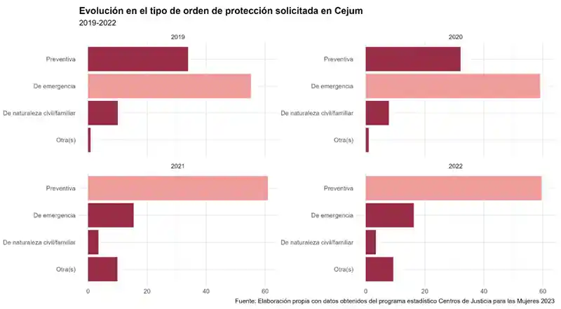 Entre 2019 y 2022 el número de las mujeres atendidas en Cejum para el trámite de una orden de protección pasó de 64 925 a 124 345; esto representa un incremento del 91.5 %. Cuando analizamos el tipo de orden solicitada identificamos un cambio importante. Mientras que en 2019 y 2020 el mayor porcentaje de órdenes solicitadas correspondía a órdenes “De emergencia”, en 2021 y 2022 se observa un cambio en la tendencia donde el tipo de orden que más se solicita es la “Preventiva”.5
