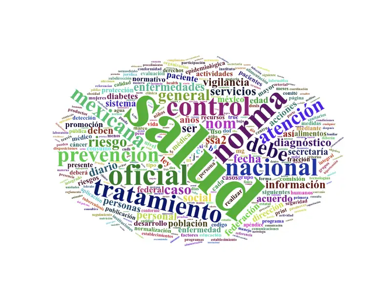 En el primer caso, en la frecuencia de la homogeneidad de palabras potencialmente constitutivas,6 de manera esperada la palabra “salud” es la que se reitera con mayor frecuencia. Si bien éste no es un resultado relevante dado que el corpus explorado son NOMs de salud, sí lo es el resto, ya que de alguna manera muestran el sentido que guarda o debiera guardar el tipo de normatividad explorada, teniendo como resultado las palabras “control”, “tratamiento”, “prevención”, “atención”, “servicios” y que pudiera sugerir el objetivo que persiguen los documentos. La relevancia radica en si estos resultados pudieran seguir como una hipótesis a comprobar, es decir, si estos ordenamientos están dirigidos a la vigilancia y tratamiento jurídico (vinculación procedimental en el sistema de salud) o como guías de práctica clínica, y concluir si estas son parte del proceso de la administración en salud o sólo una dirección clínica o terapéutica.