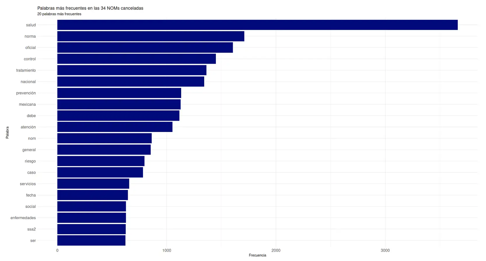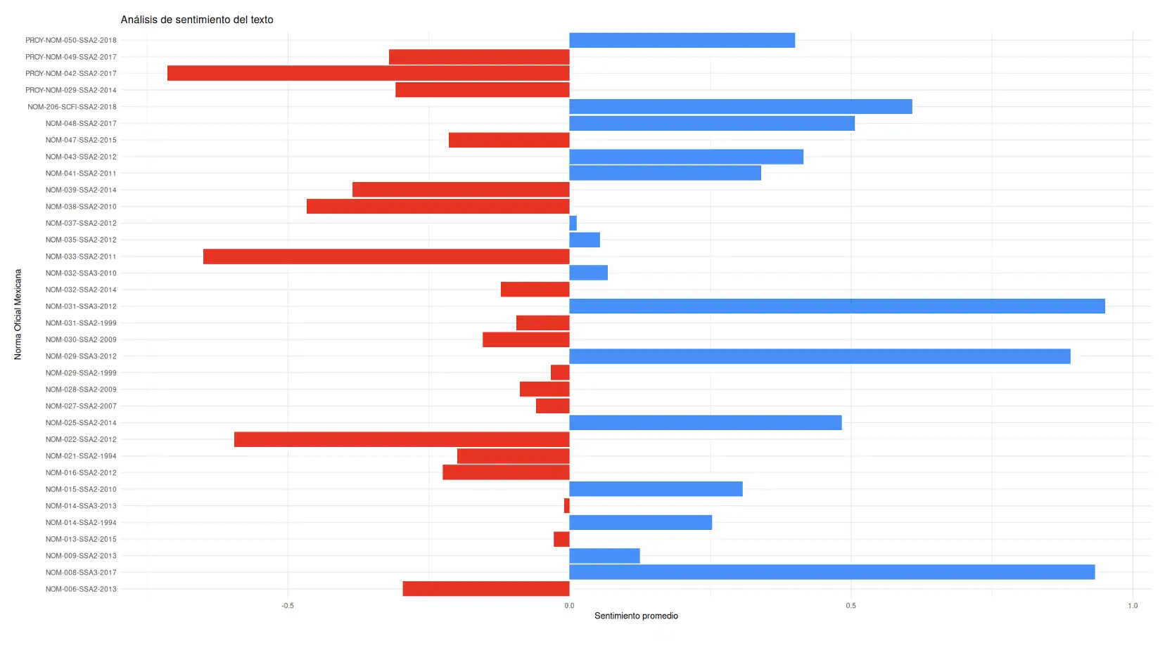 El corpus de trabajo surge de la recopilación de las NOMs enlistadas a cancelar, en materia de salud, dentro del Suplemento del Programa Nacional de Infraestructura de la Calidad 2023.5 Estas normativas se procesaron y se extrajo el texto de los documentos en formato PDF. Se hizo un preprocesamiento utilizando el pipeline del paquete {tidytext}, que incluyó la eliminación de stopwords en español y la extracción de conteos de n-gramas. Posteriormente, se asignó una carga de sentimiento a las palabras en las NOMs mediante un corpus anotado en español.
