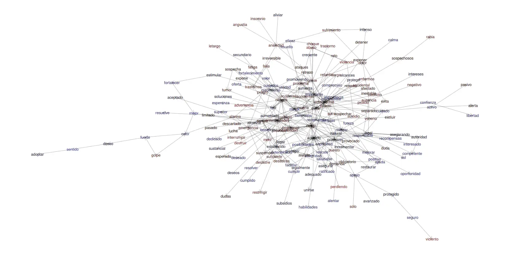 Podemos observar que las palabras que exhiben una mayor centralidad de grado (es decir, que conectan el mayor número de conceptos) y centralidad de intermediación (que forman puentes entre regiones conceptuales) se tratan de palabras de carga negativa, como: riesgo, enfermedad, evitar. Resalta el concepto promover, de carga positiva, que también ocupa una posición negativa. Por el contrario, los conceptos más periféricos se tratan de palabras puntuales asociadas a tópicos específicos de Normas específicas.