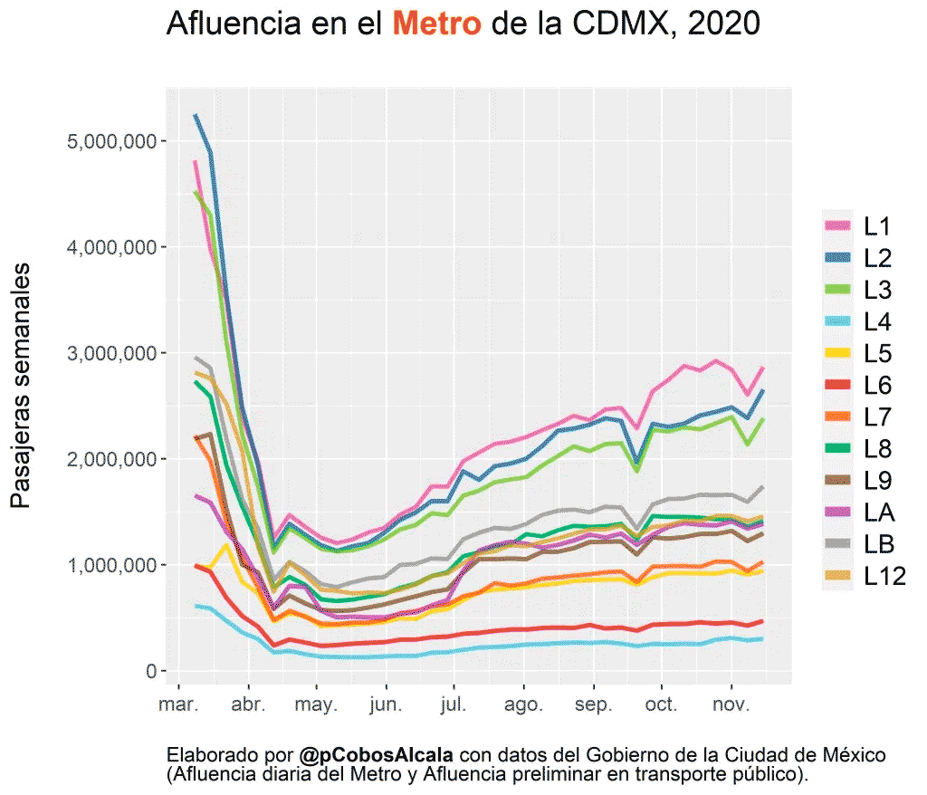 El Metro, como prácticamente cualquier otro medio de transporte, presentó una disminución de la movilidad abrupta a mediados de marzo, continuada de niveles mínimos en abril y mayo, seguida de un ascenso constante y gradual a partir de junio, pero que todavía está lejos de las cifras prepandemia. Si bien todas las líneas presentan esta tendencia, no todas lo hacen en la misma medida.