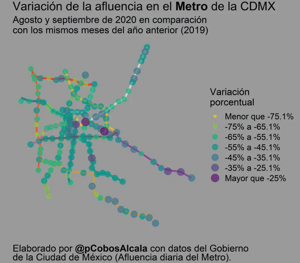 Notoriamente, la menor variación está en la zona céntrica de la ciudad, así como en tres líneas que van a zonas periféricas en el oriente: líneas A, B y 12. El comportamiento de la línea 12 es bastante interesante. Casi todas las estaciones de Tláhuac a Atlalilco (oriente) están entre las que presentan menor variación, mientras que, por el contrario, de Mexicaltzingo a Mixcoac (poniente) están en categorías de mayor variación. Otras estaciones presentan una variación por dar servicio a zonas con mayor presencia de actividades en específico. Por ejemplo, una mayor variación (transportación de relativamente menos personas) está en algunas estaciones de centros oficinistas (como las cercanas a Insurgentes y Reforma), educativos (como las de la UNAM o el IPN), y sociales (como Villa-Basílica). En la zona céntrica, las estaciones que presentan niveles cercanos a 2019 son aledañas a estaciones cerradas: Candelaria y Pino Suárez son de las tres estaciones que casi transportan a la misma cantidad de personas que el año pasado pues Allende, Merced y Zócalo (estaciones cercanas) permanecieron cerradas. Otra de las estaciones con mayor variación y que transporta casi al mismo número de personas es Apatlaco, la cual da servicio a la Central de Abastos.