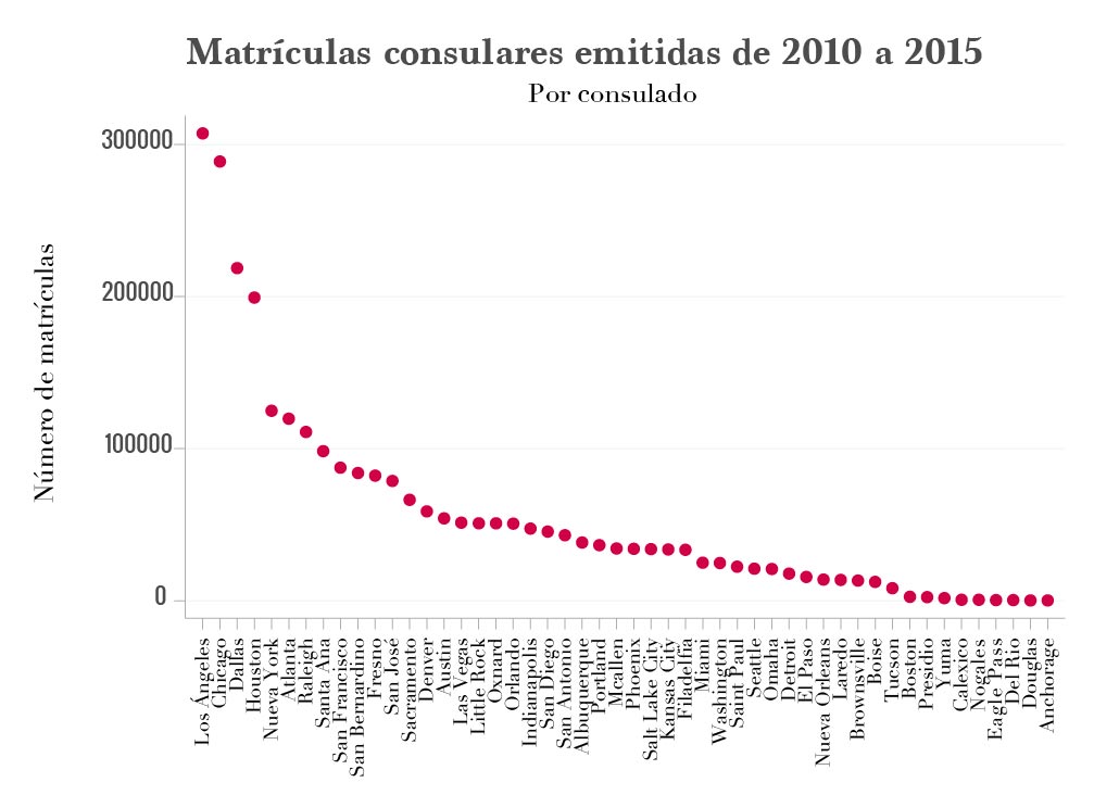 Las matrículas sirven para aproximarnos a saber el lugar de residencia de los mexicanos indocumentados. Es un aproximado, porque, dado que no hay consulados ni en todos los estados de Estados Unidos ni en todas las ciudades, no sabemos más que el area geográfica aproximada donde viven. El consulado que más matrículas ha emitido es el de Los Ángeles, con un total de 307 mil 351 matrículas. En segundo lugar está el consulado de Chicago con 288 mil 754, seguido del de Dallas con 218 mil 766 matrículas emitidas. Si pensamos en el tamaño de la población mexicana en California, Illinois y Texas, este hecho no soprende. Según datos del Pew Reaserch Center, estos tres estados junto con Florida, Nueva York y Nueva Jersey son hogar para el 59% de los migrantes indocumentados.