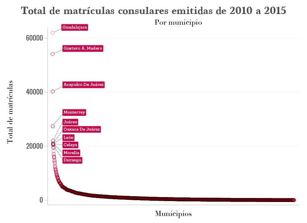 Si vemos el antiguo municipio de residencia de los matriculados, podemos observar que los mexicanos que más las tramitaron son de Guadalajara, con un total de 62 mil 028 matrículas emitidas entre 2010 y 2015; el segundo lugar de origen más común fue la delegación Gustavo A. Madero, con 54 mil 085 matrículas expedidas a personas de este lugar; seguido por las 40 mil 286 matrículas emitidas a acapulqueños.
