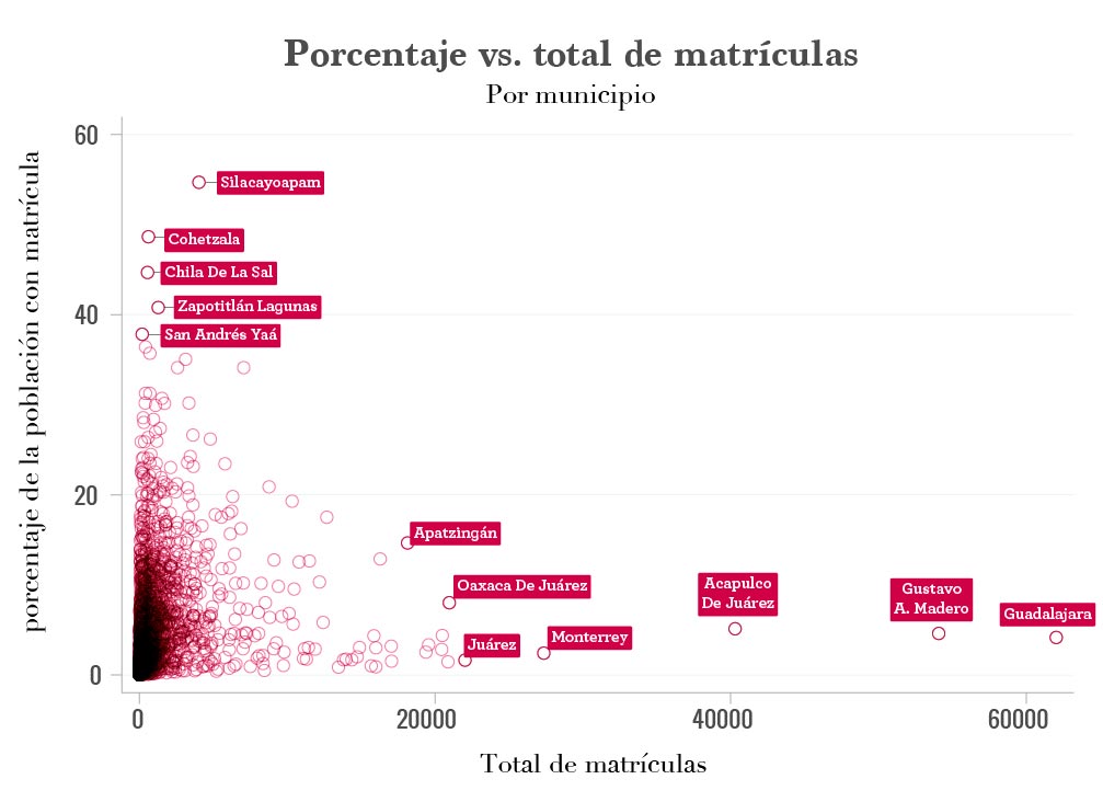 Si comparamos totales de matrículas contra el porcentaje de la población que éstas representan podemos ver que la mayoría de los migrantes vienen de municipios muy poblados pero que, en algunos municipios, una gran parte de su población emigró. Por ejemplo, aunque las matrículas emitidas a tapatíos representan únicamente 4.2% de su población, concentran 2.2% del total de matrículas emitidas entre 2010 y 2015. En cambio, las matrículas emitidas a personas de Silacayoapam sólo representan 0.1% del total, siendo que 54.7% de su población tiene una matrícula consular.
