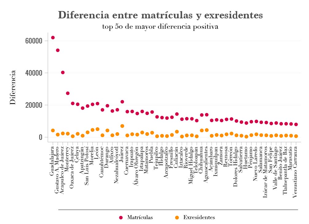 Bajo el primer escenario, y si hacemos el supuesto de que efectivamente quienes se fueron regresaron a su mismo municipio, la diferencia entre los matriculados y los que vivían en Estados Unidos y ahora residen en México son los ciudadanos que esperaríamos faltan de regresar por cada municipio. Se puede pensar que Guadalajara, Gustavo A. Madero y Acapulco de Juárez recibirían una mayor cantidad mexicanos que el resto de los municipios en caso de una deportación masiva.
