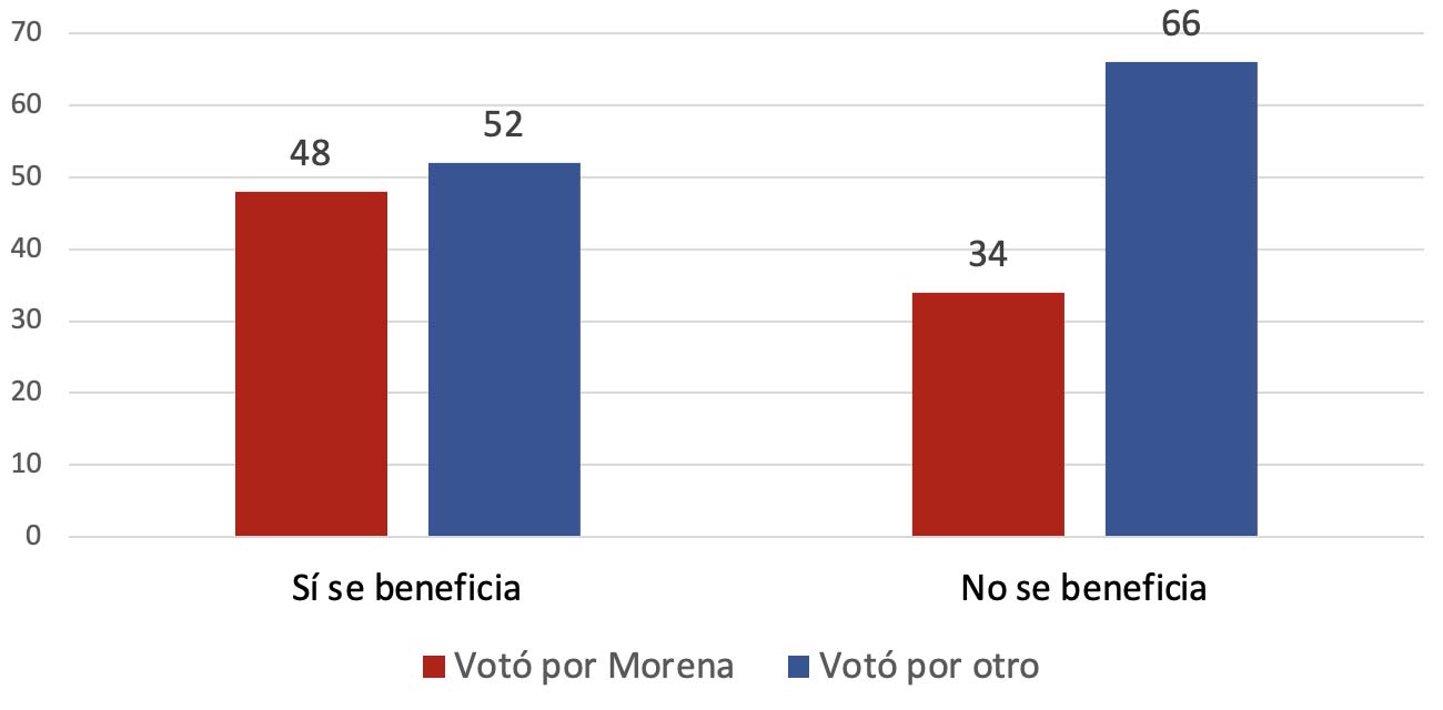 La diferencia entre la votación total de cada candidato y aquella que obtuvieron en el conjunto de votantes que reciben beneficios de los programas sociales es la mejor estimación de la aportación marginal de los programas sociales a los candidatos. La votación por la candidata de Morena entre los votantes que reciben beneficios de programas sociales es ocho puntos más alta de lo que recibió en el total de la votación.
